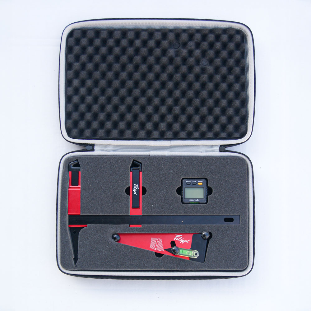 A Filippi-branded hard carry case built as a true boat “first-aid kit”: essential hand tools for quick adjustments and on-site fixes, plus three organiser boxes with the most common spare parts and shims. Includes also a magnetic digital angle gauge for accurate setup checks, magnetic bubble level and tape measure.